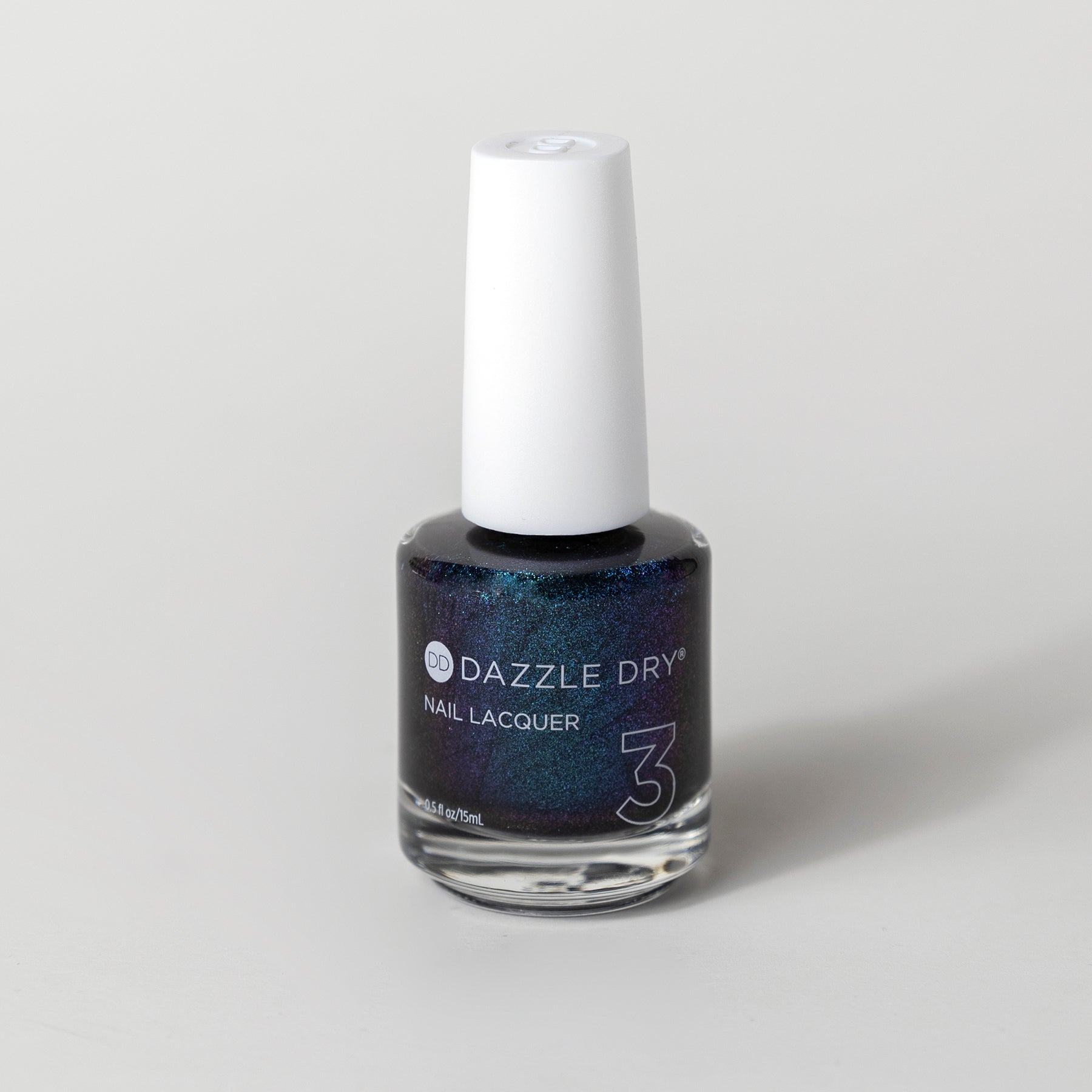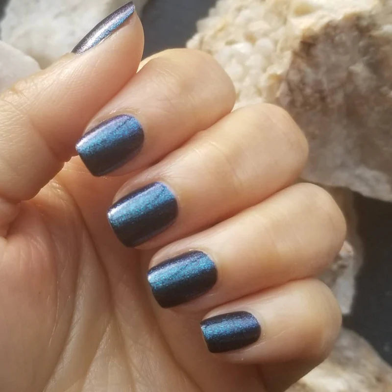 A galaxy-inspired duochrome that shifts blue, purple and green against a black base.