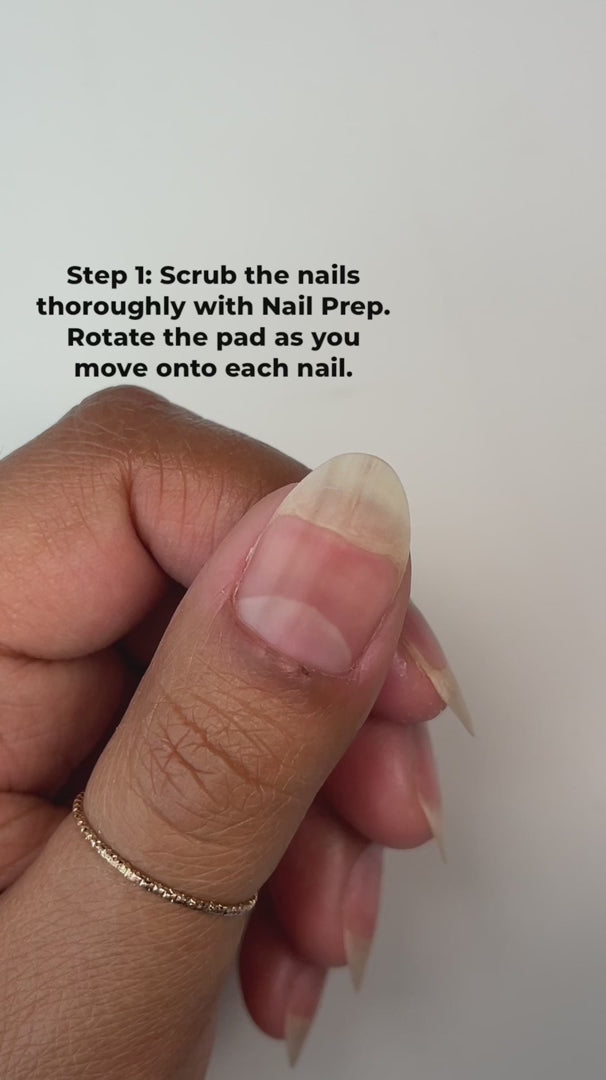 Step 1: Nail Prep Scrub each nail with a lint-free pad thoroughly to remove any oils or lotions.
