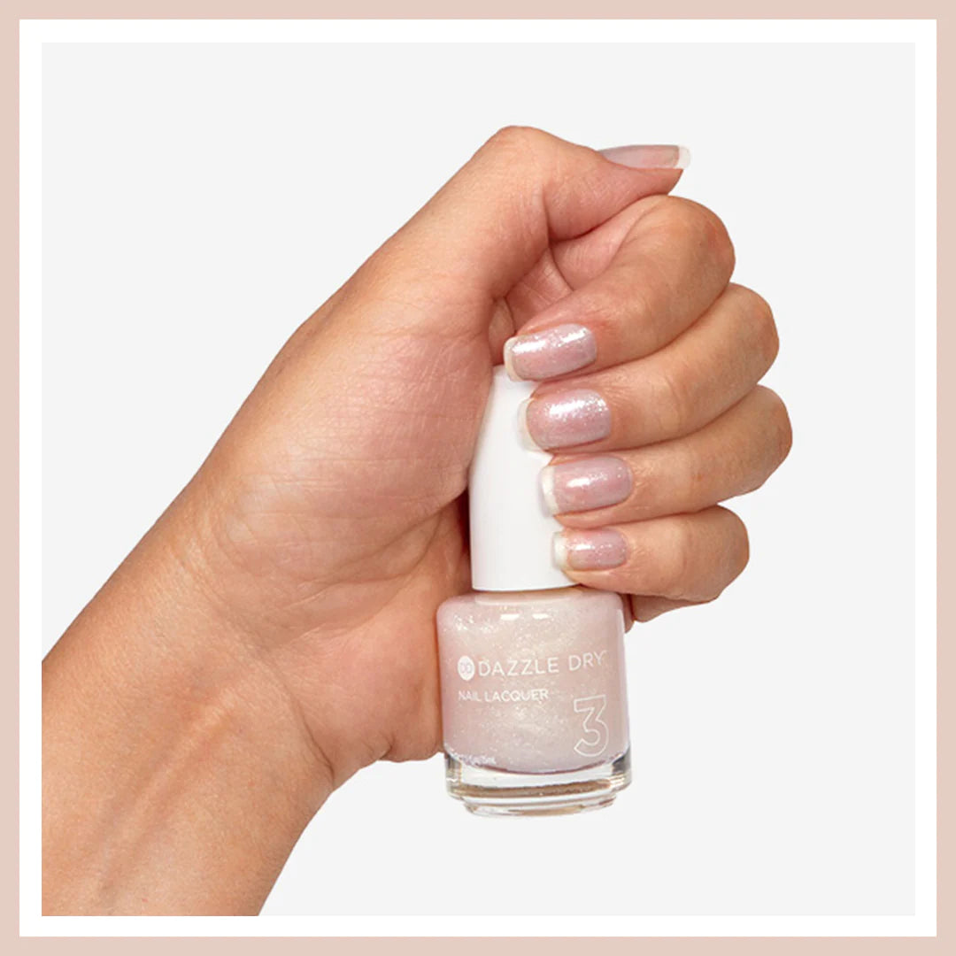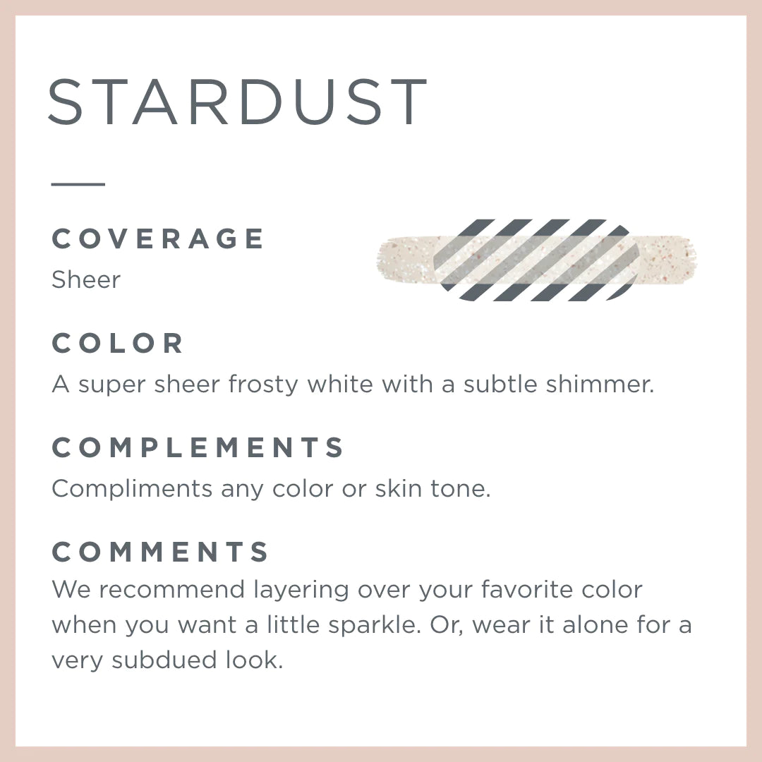 A super sheer frosty white with a subtle shimmer. We recommend layering over your favourite colour when you want a little sparkle. Or, wear it alone for a very subdued look.  Compliments any colour or skin tone.